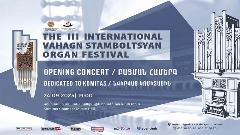 Սեպտեմբերի 24-ին՝ ժամը 19:00, Կոմիտասի անվան կամերային երաժշտության տանը (Իսահակյան 1) տեղի կունենա Վահագն Ստամբոլցյանի անվան երգեհոնային երաժշտության միջազգային երրորդ փառատոնի հանդիսավոր բացման համերգը` նվիրված Կոմիտասին: