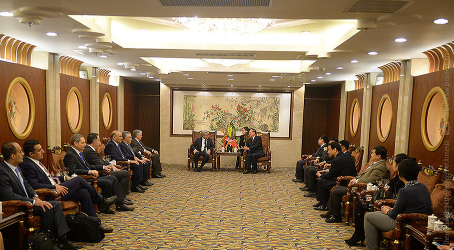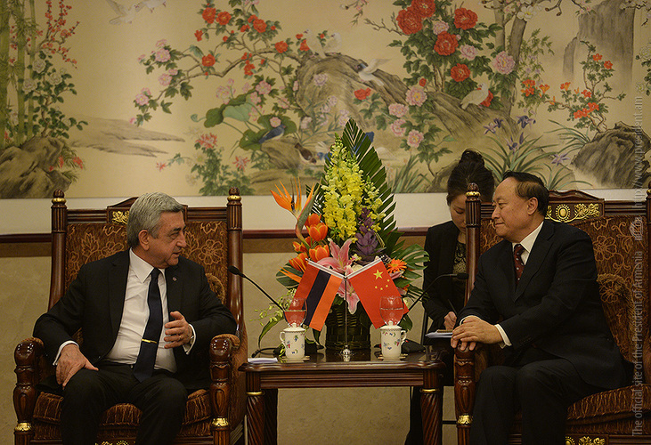 Անդրադառնալով դիվանագիտական հարաբերությունների հաստատումից ի վեր Հայաստանի և Չինաստանի միջև փոխգործակցության զարգացման ընթացքին՝ Սերժ Սարգսյանը գոհունակությամբ է ընդգծել, որ բարեկամ Չինաստանի հետ հարաբերությունները դինամիկ զարգանում են՝ տարեցտարի ներառելով նոր ոլորտներ, ինչը վկայում է փոխադարձ շահագրգռվածության մասին: Հանրապետության Նախագահը նշել է, որ այդ փաստն արձանագրվել է իր և ՉԺՀ Նախագահ Սի Ծինփինի կողմից ստորագրված բարեկամության, համագործակցության և գործընկերության հարաբերությունների հետագա զարգացման և խորացման մասին համատեղ հռչակագրում: