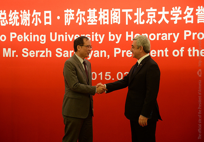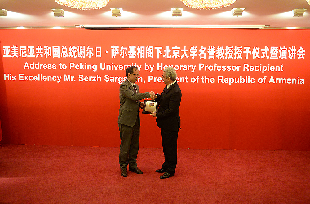 Պեկինի համալսարանում այնուհետև կայացել է Սերժ Սարգսյանի հանդիպումը ուսանողության և պրոֆեսորադասախոսական կազմի հետ: Հայաստանի Նախագահին հանդիպման ժամանակ շնորհվել է Պեկինի համալսարանի պատվավոր պրոֆեսորի կոչում: