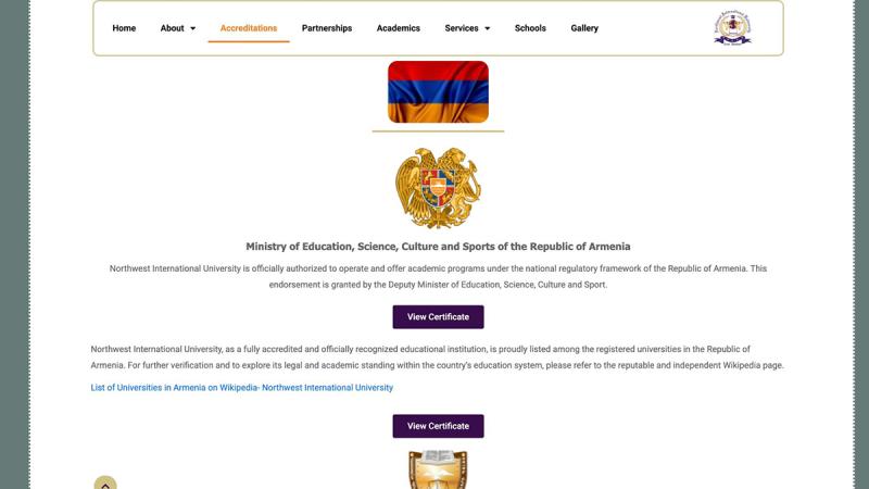 North West International University-ն (Հյուսիսարևմտյան միջազգային համալսարան, NWIU) ունի կայք, որի «հավատարմագրումներ» բաժնում Հայաստանի հետ համագործակցության վերաբերյալ առանձին բաժին կա։