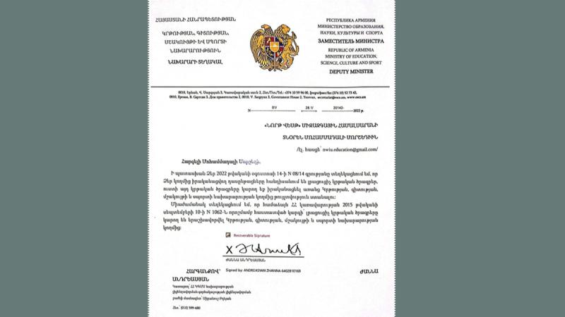 Որպես «ապացույց» ներկայացվում է 2022թ․ ԿԳՄՍՆ փոխնախարար Ժաննա Անդրեասյանի ստորագրությամբ մի նամակ, սակայն դա լիցենզիայի մասին չէ։