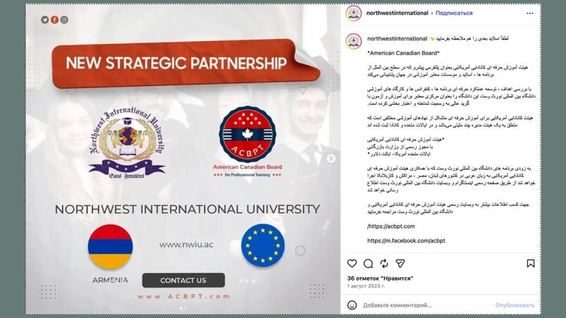 hetq. Իրանցի Մոհամմադալի Մորշեդին ներկայանում է որպես North West International University (Հյուսիսարևմտյան միջազգային համալսարան, NWIU)-ի ղեկավար։ Նա տարբեր հարթակներում շահարկում է Հայաստանի անունը՝ նշելով, թե իբր «համալսարանը» հիմնադրվել և գտնվում է Հայաստանում, ունի օրինական գրանցում և ԿԳՄՍ նախարարության կողմից տրված լիցենզիա։ Ենթադրյալ համալսարանի կայքում նշվում է, որ այն ներառված է Հայաստանի բուհերի ցանկում։ Թեև Մոհամմադալին Հայաստանում երկու ընկերություն է գրանցել, դրանք ոչ մի կրթական գործունեություն չեն իրականացնում։ Փաստացի, նման համալսարան Հայաստանում գոյություն չունի, ԿԳՄՍ նախարարությունը որևէ լիցենզիա չի տվել նրան։