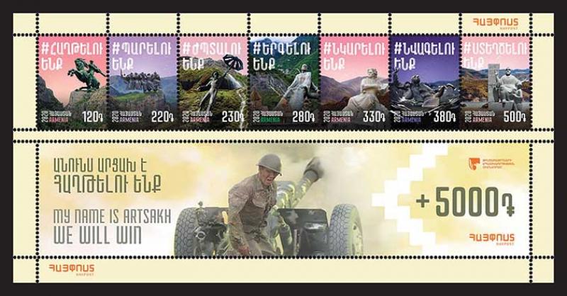 Вместе с семью марками в форме малого листа ЗАО «Айпост» также выпустила благотворительный купон номиналом в 5000 драмов, на котором изображен солдат Альберт Оганесян во время боевых действий, впоследствии посмертно награжденный медалью Арцаха «За отвагу». В левой части купона изображены слоганы «МОЕ ИМЯ-АРЦАХ» и «МЫ ПОБЕДИМ» на армянском и английском языках.